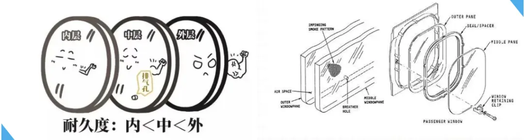 最外层和中间层的密封层用较厚且高强度的透明树脂材料制成,具有承受几倍座舱内外压差的能力。外层最坚固,直接承受90%以上的压力差,是主要承力层。中间层带有通气孔,也叫“呼吸孔”,是大家平常看到的飞机窗上的小孔,它允许机舱内的高压空气缓慢进入夹层,使外层玻璃均匀受力。当压力调节失效时,外层玻璃会优先破裂,中层仍能作为备用承压层,是结构中的“安全缓冲层”。接触乘客的内层用较薄的轻质透明树脂材料制成,内层不密封不能承受压差,但是可以起到装饰和对中层辅助防护作用,能够防止被乘客刮伤或者碰撞。