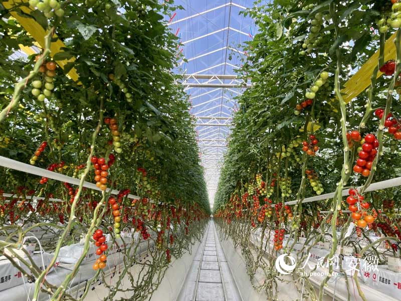 有了数字化、智能化新技术的应用,桐城现代智慧农业产业园实现了番茄等高附加值作物的全年高效、绿色生产,单平方米产量超25kg,是传统温室产量的6至8倍,可谓硕果累累。