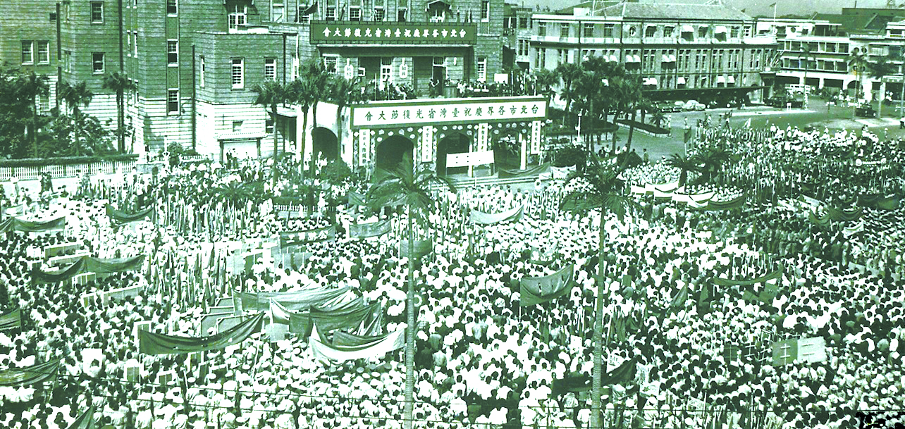 下午3时,台湾各界人民代表在公会堂举行盛大的台湾光复庆祝大会,陈仪率党政军及各方代表出席并致祝辞。有记载称,台北40余万市民,“老幼俱易新装,家家遍悬彩灯,相逢道贺,如迎新年,鞭炮锣鼓之声,响彻云霄,狮龙遍舞于全市,途为之塞”。台湾学者戚嘉林回忆说,那一天,整个台北市都沸腾了,“50年的‘皇民化运动’一天就被风吹掉了”。当时还在中学读书的廖天欣回忆起在杂志上看到的文章《光复的意义》,他清楚地记得这段话:“我们在台湾光复的时候,所发现的第一个事实是民族精神的振兴,第二是国土的重圆,第三是家人再聚,第四是统一的国家。”