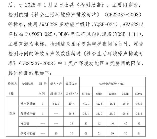 检测结果显示,夜间电梯运行时黄某住宅噪声值超过《社会生活环境噪声排放标准》(GB22337-2008)中1类声环境功能区A类房间限值(昼间40dB(A)/夜间30dB(A))。黄某提交的病历表明其因睡眠问题确诊抑郁,法院认为,尽管抑郁成因复杂,但结合噪声持续时长与居住环境,可以认定噪声污染与其健康损害具有一定关联。