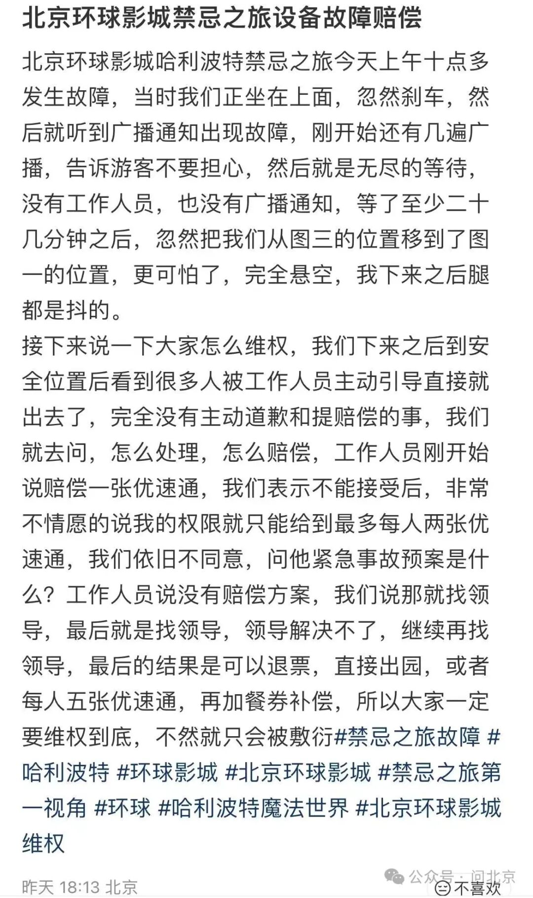 记者在社交平台看到,有网友反映10月25日上午10时多,北京环球影城哈利波特园区的“禁忌之旅”项目在运行中发生故障。经现场协商,园方最终同意为受影响游客办理退票。这一处理结果,与十月上旬“飞越侏罗纪”故障中游客经历半小时高空悬停获得玩偶补偿的处置方式形成鲜明对比。