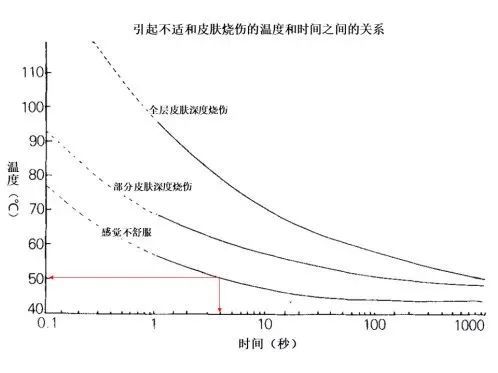 一起看看下面这张图,50℃的温度持续接触5秒,人就会感受到不舒服,随着时间延长,对皮肤的伤害程度加大。