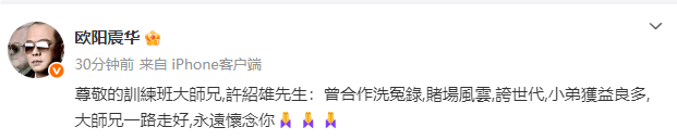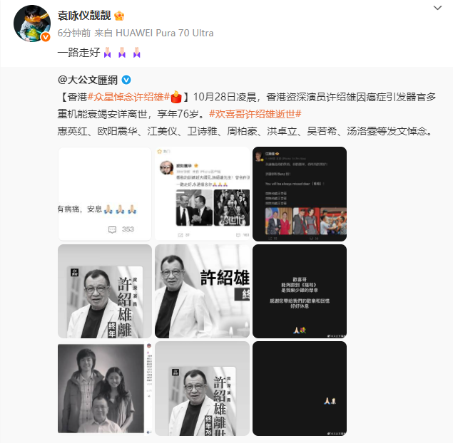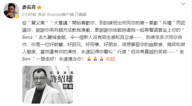 TVB官方微博发文悼念:青山远行,艺影长存。