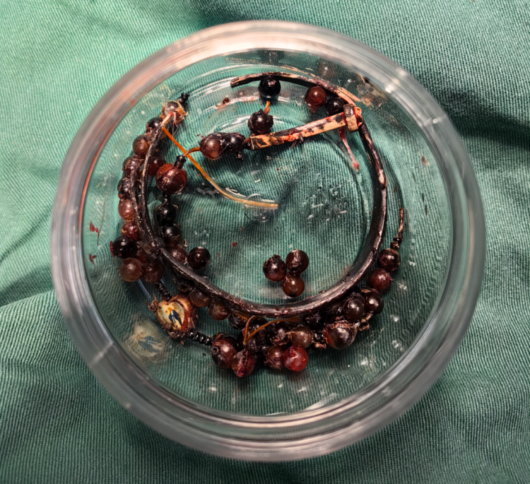 直至近期手腕部疼痛加剧,红肿明显并伴有脓液渗出,她才惊觉手镯与串珠已部分“长”入肉中,无法自行取下。最终,医生通过一个多小时的精细手术,将手镯与串珠从龚女士手腕中剥离而出,并清创引流控制感染,使患者转危为安。