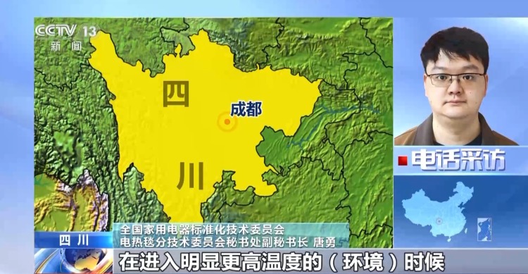 全国家用电器标准化技术委员会 电热毯分技术委员会秘书处副秘书长 唐勇:目前的发热片主要有碳基膜,包括碳纤维膜、石墨烯膜还有一种是金属膜,还有普通的金属发热丝,碳基膜它的特点就是加热速度会比较快,金属膜和金属加热丝的发热量稳定,但是有一个缺点就是不抗弯折,揉搓和弯折有可能导致它直接损坏。