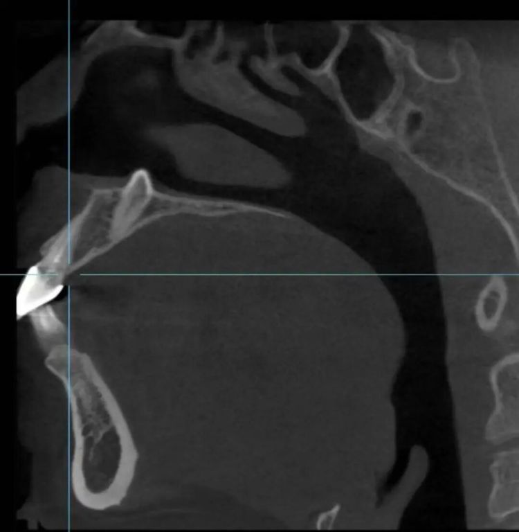 “这颗多生牙的牙冠向上,朝鼻腔方向伸长,牙尖已突破鼻底骨头,触及鼻底黏膜。如果不处理,在正畸移动牙齿的过程中,它会形成巨大阻碍,导致邻牙牙根吸收、正畸失败,甚至可能在未来穿破鼻腔,影响健康。”台州市康复医院口腔科主任医师戴杰介绍。
