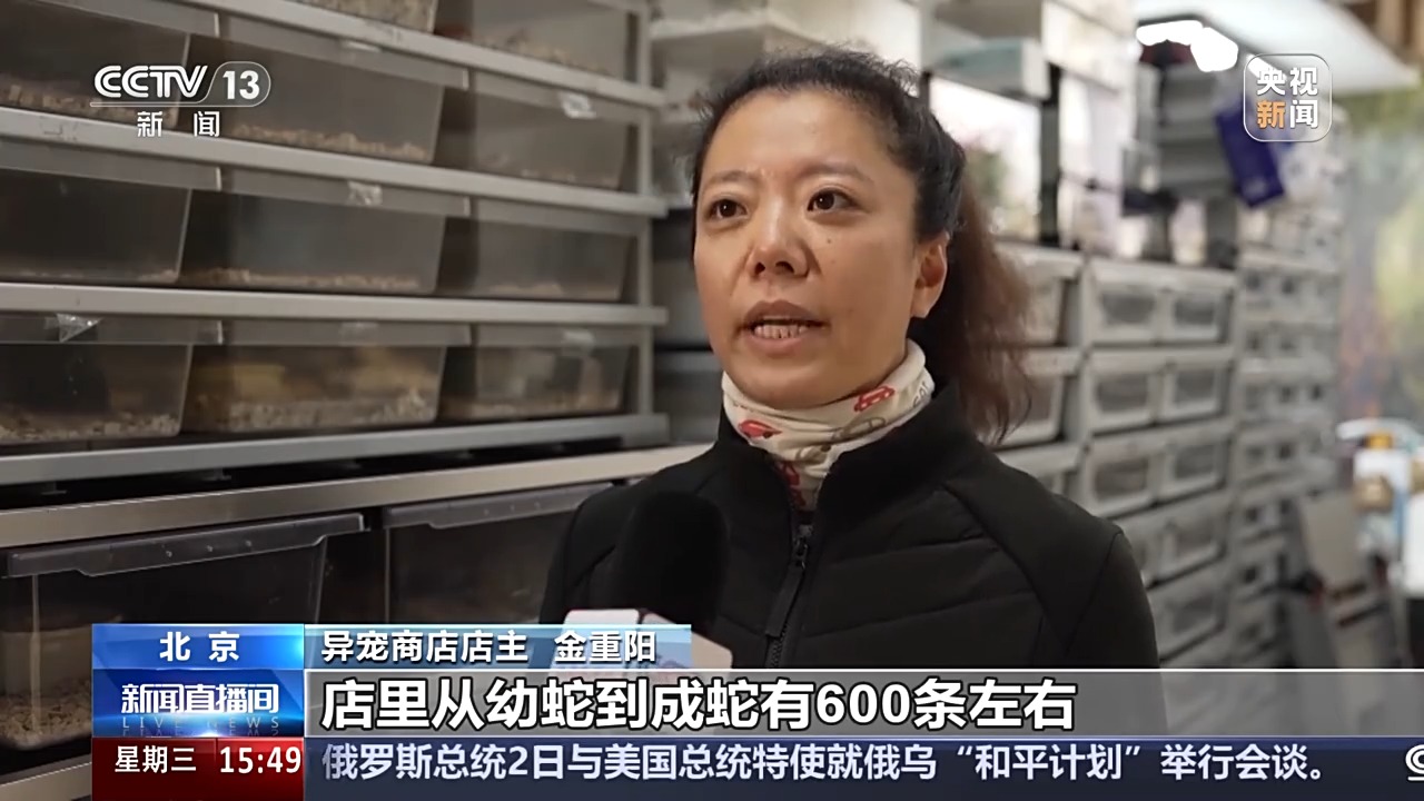 异宠商店店主 金重阳:店里从幼蛇到成蛇有600条左右,其中牛蛇体形特别大,可以长到两米七到三米左右。它需要一个更大的空间,所以大家要是想养蛇的话一定要做好心理准备,给它们一个合适的空间、合适的温度。