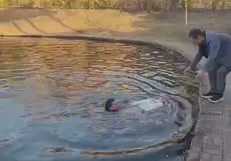 于是他一个箭步冲向池塘边