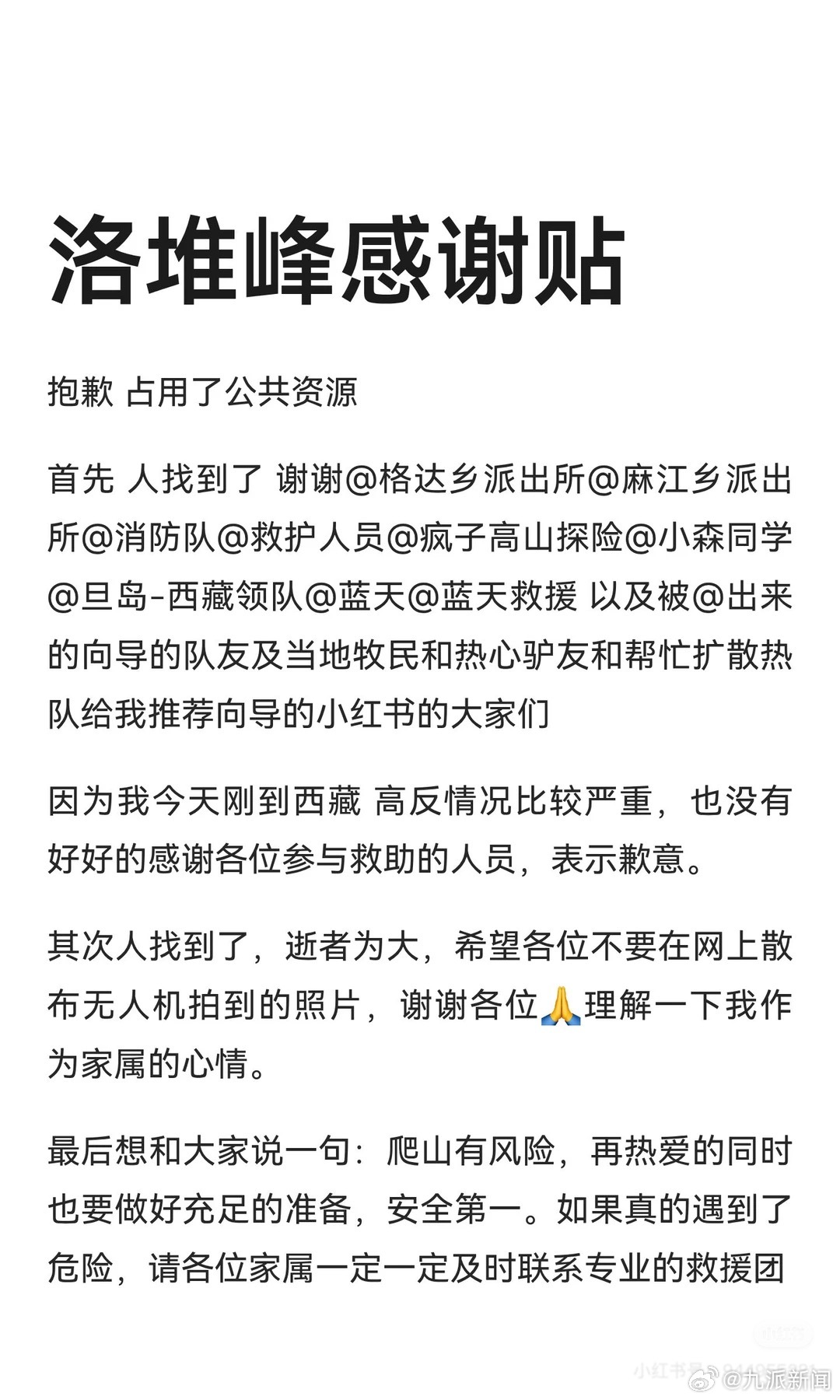12月4日晚,家属发帖称“人找到了,逝者为大,希望不要散布无人机拍到的照片”。