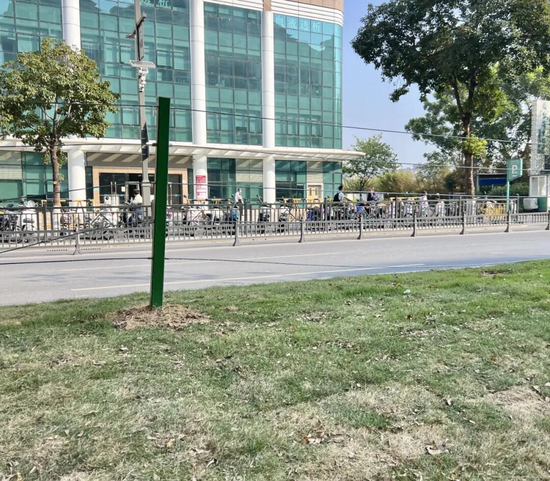 12月5日,“记者帮”赶赴事发地探访看到,石槎路中央绿化带呈现出明显的“色彩分区”,靠近地铁小坪站C口区域仍保持着视频中的鲜绿色,部分区域则是枯黄色,另有二三十米长的路段露出黄土,离此不远处有两位工作人员正安装“禁止穿越”的告示牌。“这里来往居民多,之前经常有人跨护栏横穿绿化带。”附近商户黄先生告诉“记者帮”,该路段的草坪长期遭踩踏,过去半年里曾多次看到养护人员补种,但没过多久又会出现枯黄斑秃。