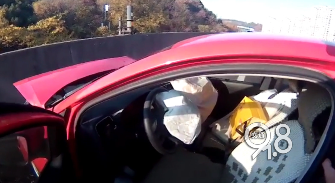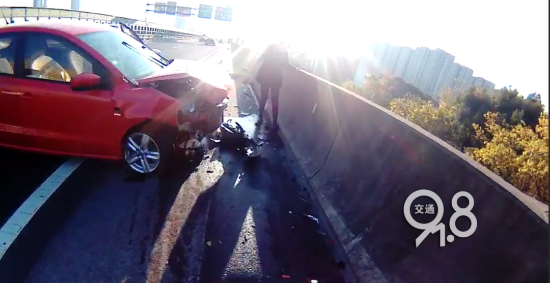 一大队民警徐洋说:“视频巡查发现,前方有一辆红色的小客车撞到右边的护栏,整个车尾横在第二车道,当时又是早高峰,我们马上紧急调令路面的值班警力陈海鹏前往现场。”