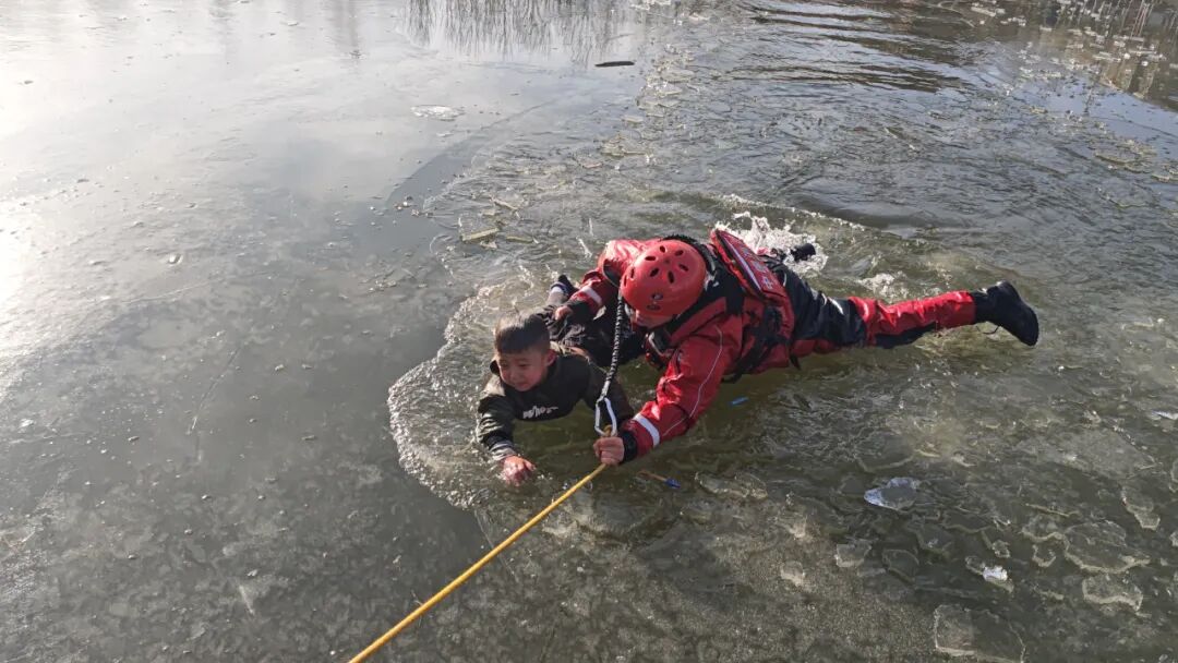 当天下午3点,4岁男童轩轩(化名)在豫海湖的冰面上嬉戏时,脚下冰层突然碎裂,轩轩坠入湖中,冰冷的湖水瞬间没过他的胸口。见此情景,岸边几位大人立即报警,因担心冰面再次碎裂,大家不敢贸然上前营救……