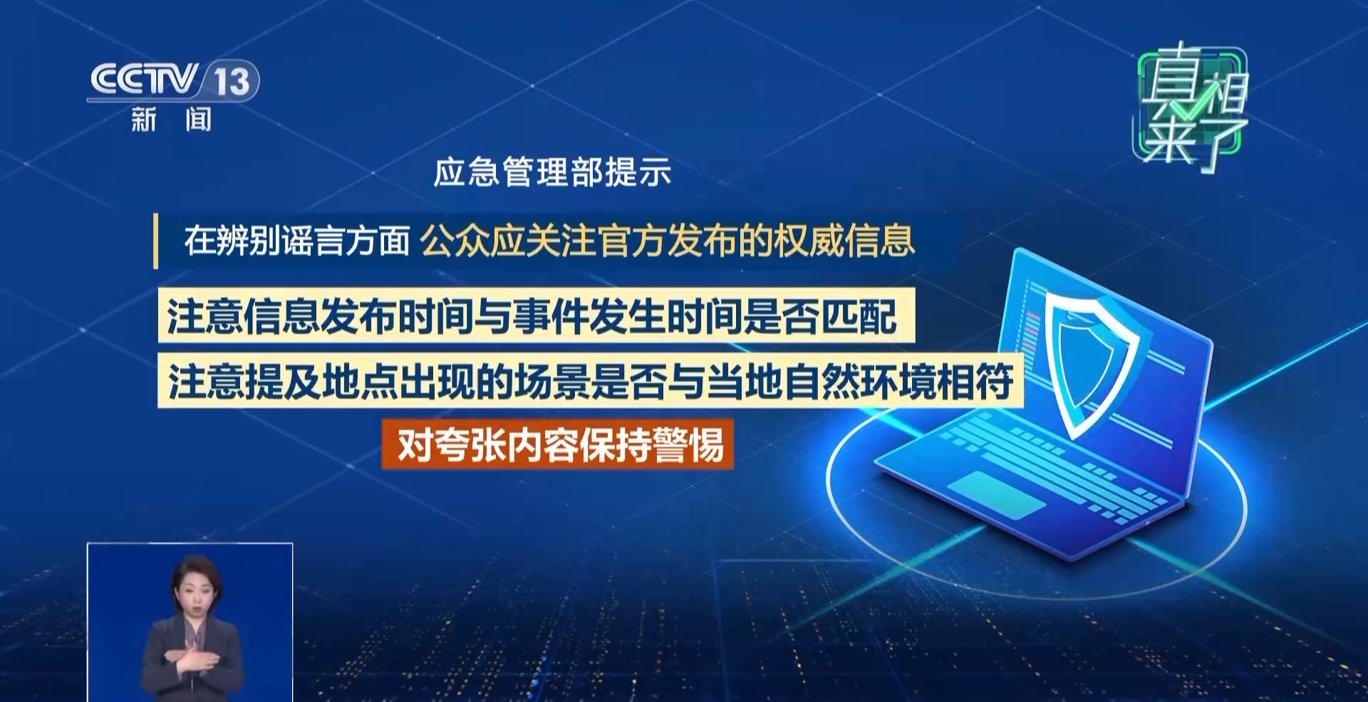 应急管理部提示,在辨别谣言方面,公众应关注官方发布的权威信息,注意信息发布时间与事件发生时间是否匹配,注意提及地点出现的场景是否与当地自然环境相符,对夸张内容保持警惕。