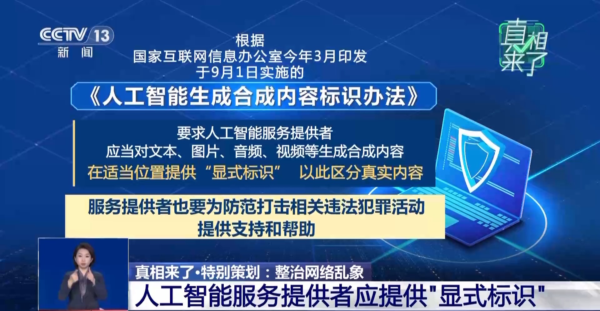 专家介绍,根据国家互联网信息办公室今年3月印发,并于9月1日实施的《人工智能生成合成内容标识办法》,要求人工智能服务提供者应当对文本、图片、音频、视频等生成合成内容,在适当位置提供“显式标识”,以此区分真实内容。同时服务提供者也要为防范打击相关违法犯罪活动提供支持和帮助。