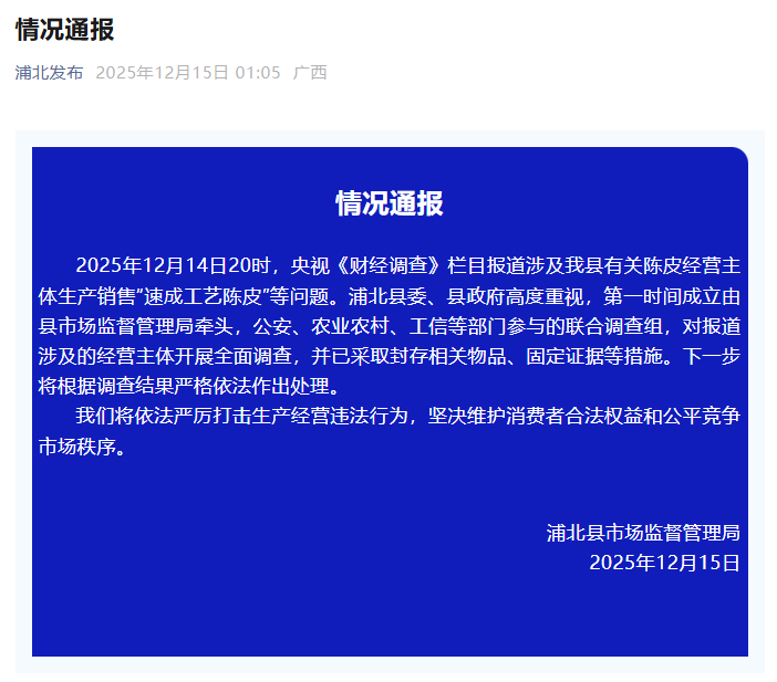 2025年12月14日20时,央视《财经调查》栏目报道涉及我县有关陈皮经营主体生产销售“速成工艺陈皮”等问题。浦北县委、县政府高度重视,第一时间成立由县市场监督管理局牵头,公安、农业农村、工信等部门参与的联合调查组,对报道涉及的经营主体开展全面调查,并已采取封存相关物品、固定证据等措施。下一步将根据调查结果严格依法作出处理。