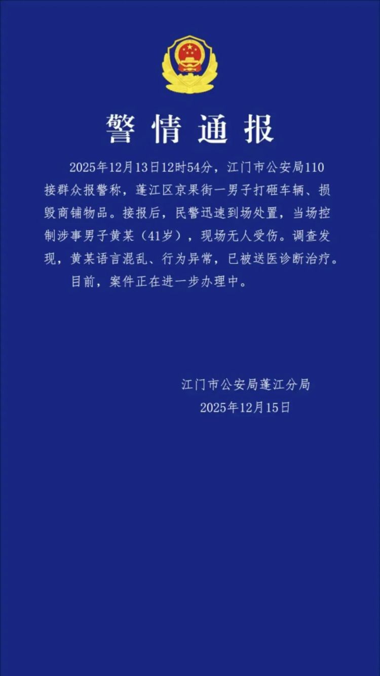 2025年12月13日12时54分,江门市公安局110接群众报警称,蓬江区京果街一男子打砸车辆、损毁商铺物品。接报后,民警迅速到场处置,当场控制涉事男子黄某(41岁),现场无人受伤。调查发现,黄某语言混乱、行为异常,已被送医诊断治疗。