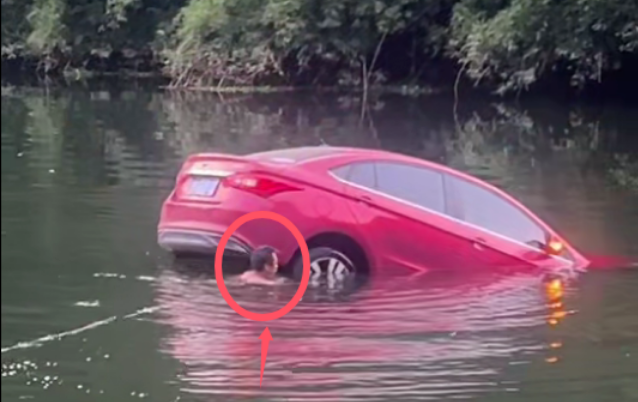 △徐日亮用救援绳绑牢落水车辆后往回游