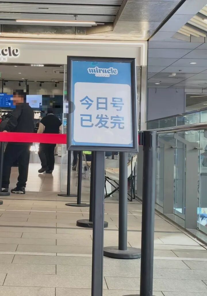 记者上午到达杭州小奇迹咖啡门店,发现没有出现上次开业时一样排队排到楼上的情况,也没有网传的大批人排队,只有店门口有十几位粉丝在排队,其中不少粉丝还是带着凳子和行李箱来的,旁边的牌子上写着:今日号已发完。