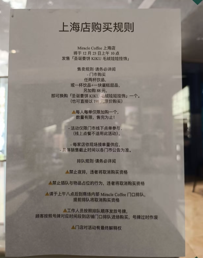 从现场粉丝的口中得知,大家排队是因为12月23日是Miracle Coffee八周年,品牌在各家线下门店推出了限量的毛绒娃娃挂饰,在门店购买两杯饮品,或者饮品+甜品也可以,再另外支付88元,就能拿到这个挂饰(也可以198元原价购买),但数量有限。