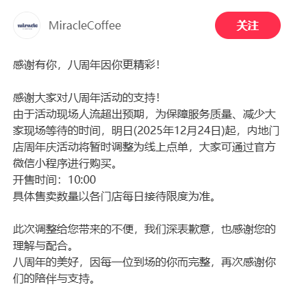据公开资料显示,Miracle Coffee由林俊杰于2017年创立,2019年进入中国大陆,首店设于上海。截至2025年12月,门店已覆盖上海、广州、成都、重庆、杭州、广州、南京等9座城市。
