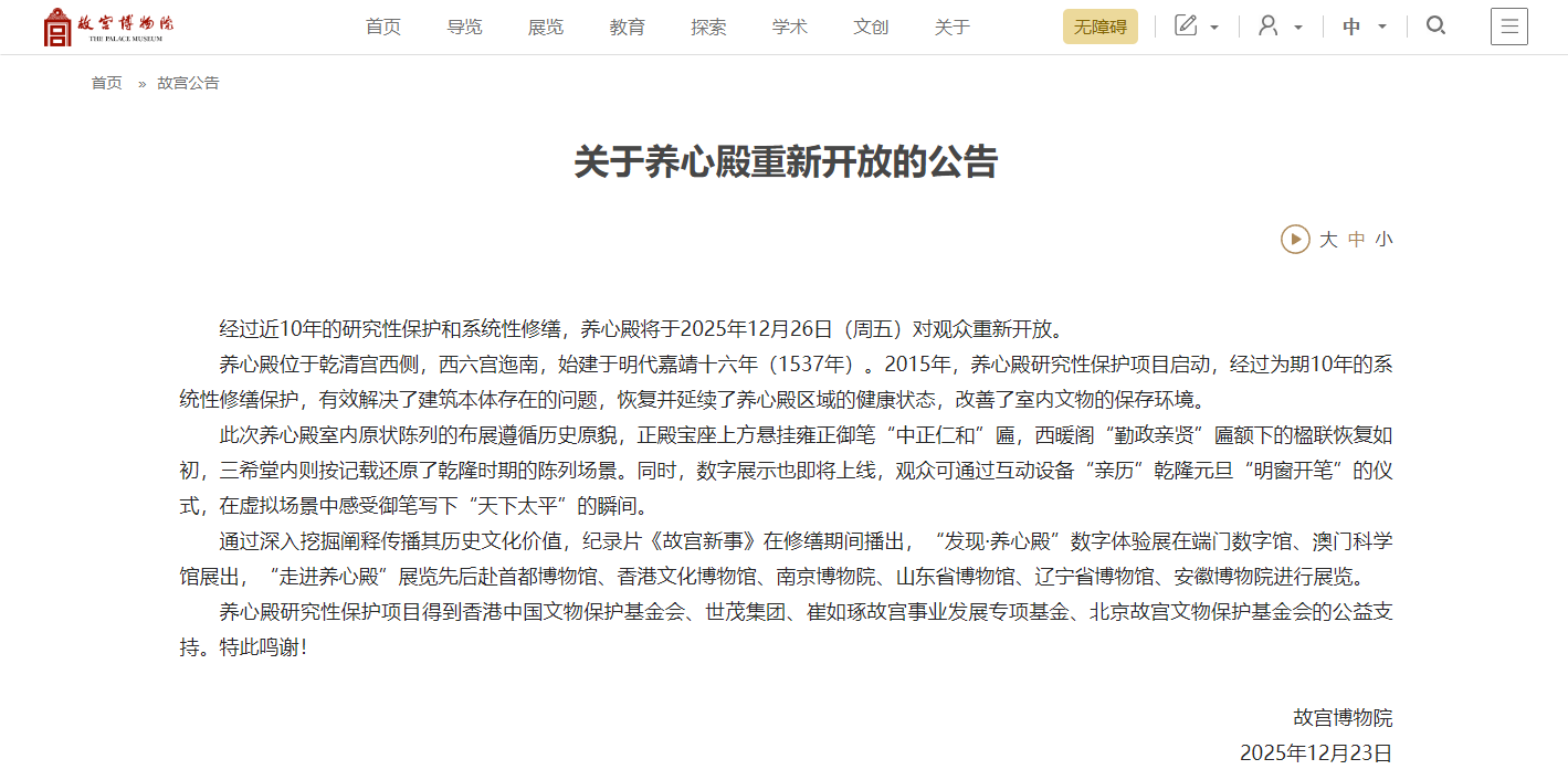 经过近10年的研究性保护和系统性修缮,养心殿将于2025年12月26日(周五)对观众重新开放。