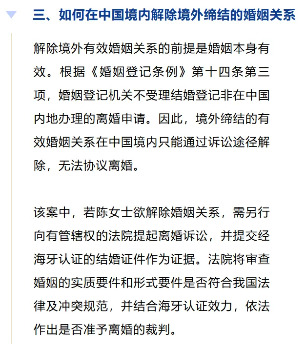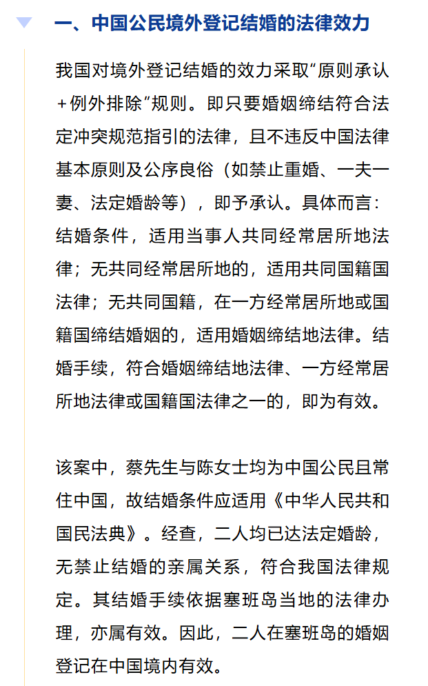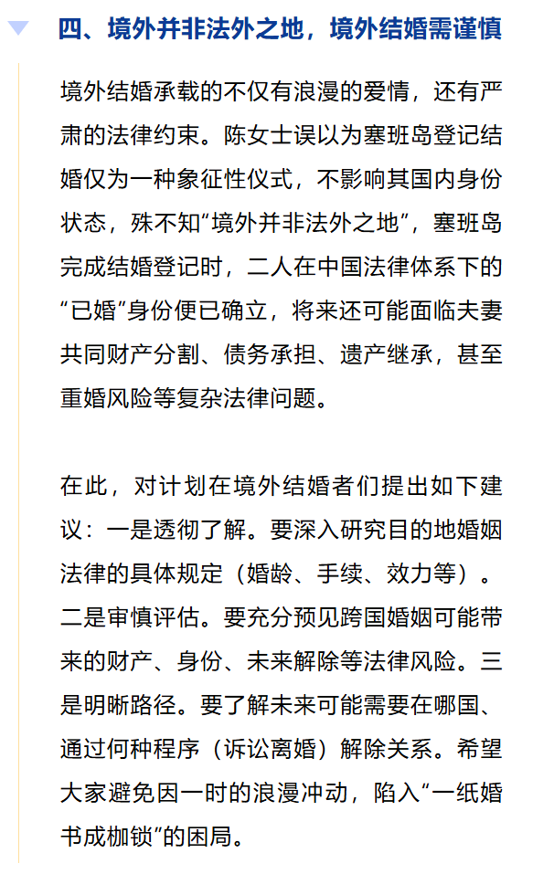 同时,法官表示,陈女士误以为塞班岛登记结婚仅是一种象征性仪式,不影响其在国内婚姻状态,但事实上,二人在中国法律体系下的“已婚”身份便已确立,将来还可能面临夫妻共同财产分割、债务承担、遗产继承,甚至重婚风险等复杂法律问题。