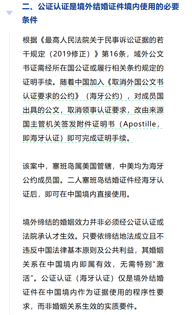 法院审理后认为,蔡先生与陈女士在美属塞班岛进行婚姻登记,二人的结婚条件符合共同居所地(中国)法律,结婚手续符合婚姻缔结地(美属塞班岛)法律,且婚姻登记证件经海牙认证,法院对蔡先生提供的婚姻登记证件的真实性予以确认。因此,二人之间的婚姻关系有效,在有效的婚姻期间,不存在所谓婚约财产的返还。如双方需要离婚,可在国内通过诉讼途径解决。