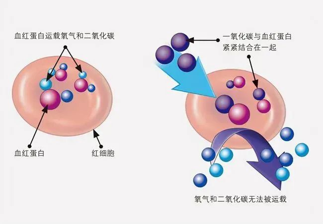 一氧化碳吸入体内,会与氧气争夺血液中的血红蛋白,使氧气不能与血红蛋白结合,导致人体缺氧。