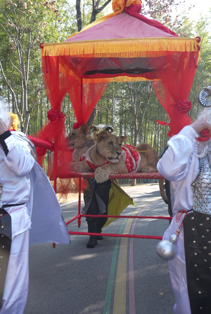 据介绍,那两只小狮子只有6个多月大,名叫“皖星”和“皖月”,是双胞胎,从小由饲养员养大,平时不太爱活动,“饲养员每天只能抱来抱去的”,动物园也希望借由“狮王巡游”的节目让两只小狮子出来活动活动,为了保证安全,坐在花轿上的小狮子脖子上系了栓绳,另一头固定在花轿上,花轿旁还安排了两三名安全员防止游客直接接触。