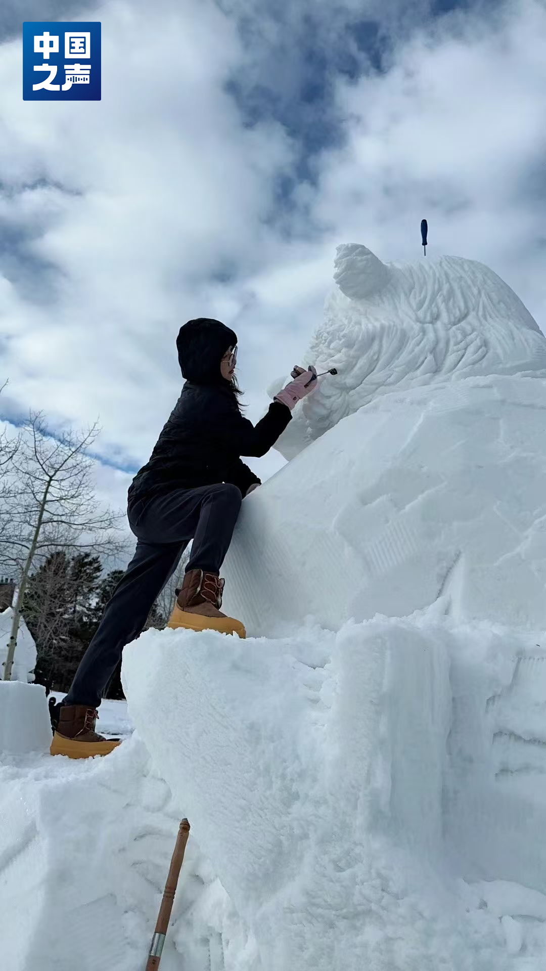 雪雕这堂课,必须在室外上。雪窸窸窣窣地落着,王海峰没有戴帽子,她跪在雪坯上,手持雪铲,正在雕刻一匹马。一下,又一下,每一铲都沉稳用力。渐渐地,马的眼睛、鼻孔、嘴依次浮现,鬃毛也一簇簇变得清晰。学生的赞叹与铲车的轰鸣交织,而她神情专注,完全沉浸在自己的世界里。