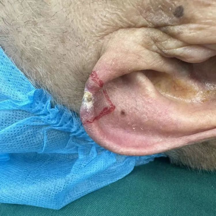 这位平时身体硬朗的七旬老人,起初并未在意,直到家人发现他耳廓上的肿物越来越明显,才催促他到杭州师范大学附属医院就诊。