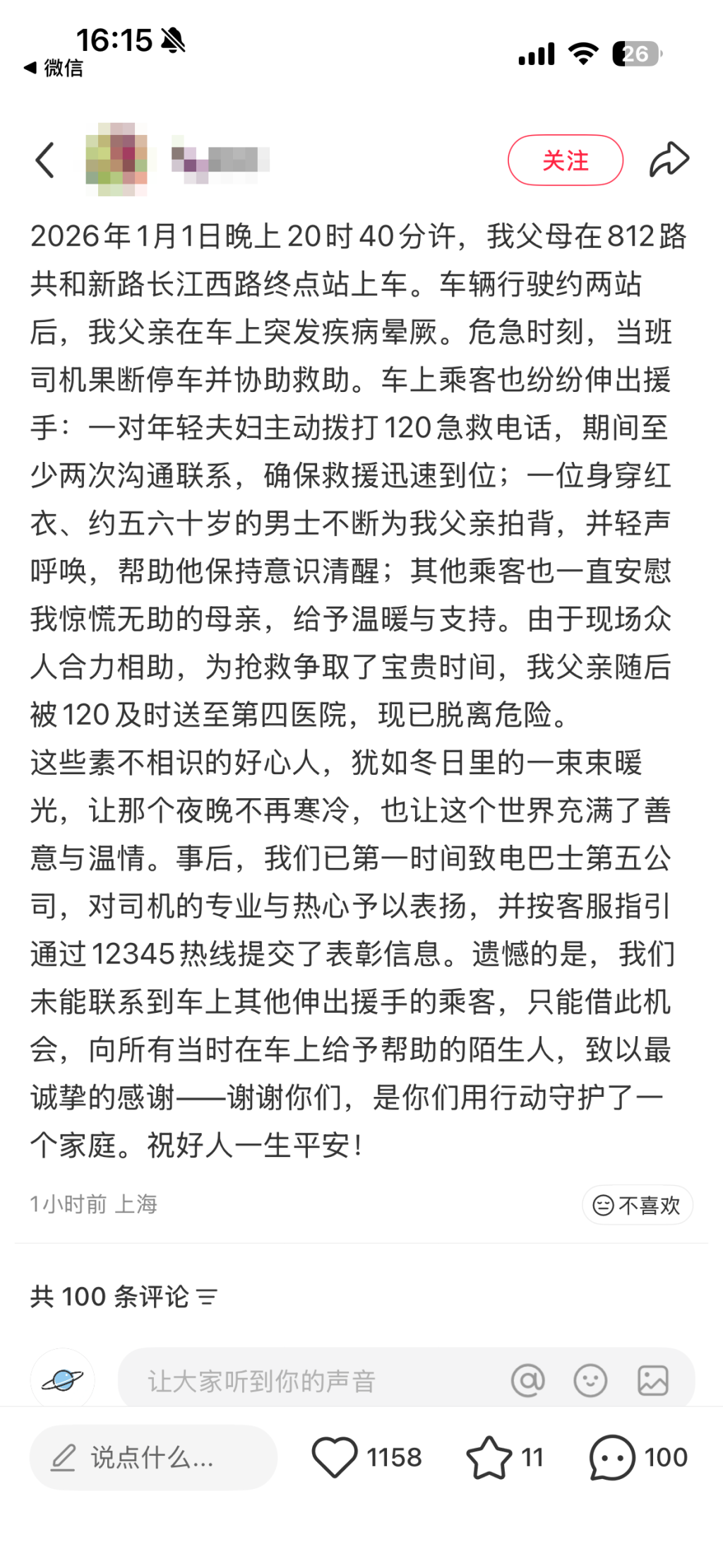 据网友发帖描述,其父母在812路共和新路长江西路终点站上车。车辆行驶约两站后,其父亲在车上突发疾病晕厥。危急时刻,当班司机停车并协助救助。