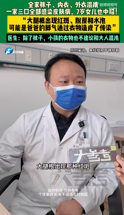 河南郑州一对夫妻和7岁女儿身上同时长皮疹,而且大腿根出现红斑、脱屑和水泡。医生询问生活习惯了解到,他们一家大人孩子的袜子、内衣、外衣全部混洗,可能是爸爸的脚气通过衣物造成了传染。