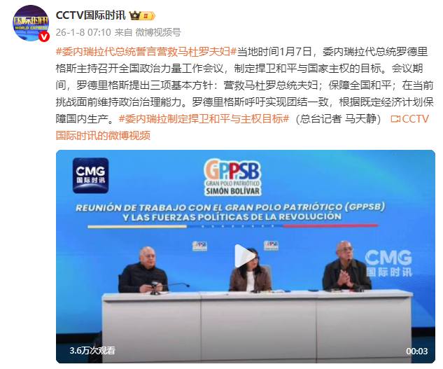 当地时间1月7日,委内瑞拉代总统罗德里格斯主持召开全国政治力量工作会议,制定捍卫和平与国家主权的目标。会议期间,罗德里格斯提出三项基本方针:营救马杜罗总统夫妇;保障全国和平;在当前挑战面前维持政治治理能力。罗德里格斯呼吁实现团结一致,根据既定经济计划保障国内生产。(总台记者 马天静)