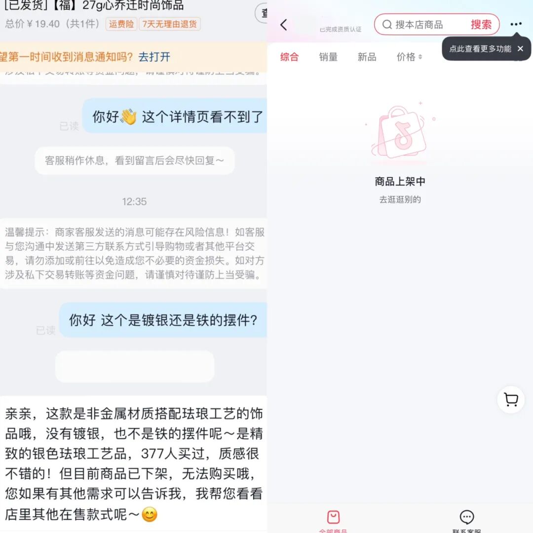 在此情况下,记者也在直播间下单购买了一款主播声称为“足银9999”的银条。然而,直播结束后不久,该商品链接便被下架,再从订单中点进详情页也无法看到具体说明。记者随后追问商家,这款产品是否为直播中所说的足银,对方并未回应。不过,通过订单中的商品快照,记者发现其材质标注为“银”,而随后客服又回复称,这是一款“银色珐琅工艺的非金属饰品”,不含银,与直播中所说的足银并非同一商品。