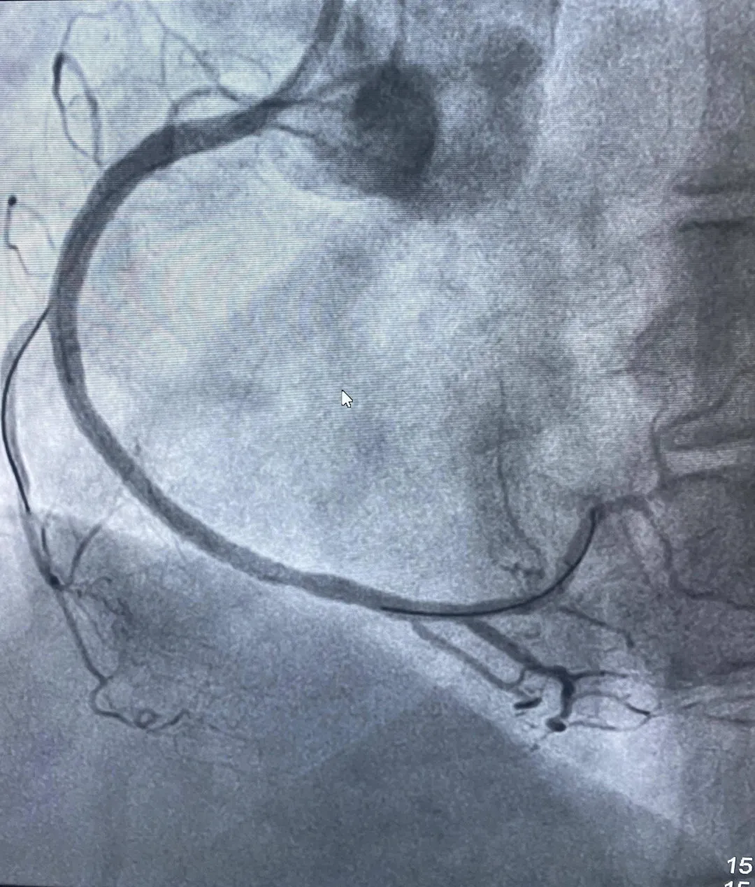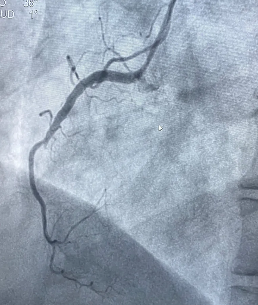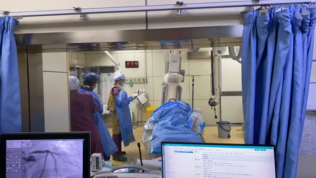 情况紧急,胸痛中心迅速响应,在与家属沟通并签署知情同意书的同时,同步办理住院手续,全程开通绿色通道,最快的速度把吕女士送入导管室接受急诊PCI治疗(经皮冠状动脉介入治疗)。在王宁夫主任医师指导下,徐鹏和钱宇峰副主任医师为她进行介入治疗,术中发现她的右侧冠状动脉近段完全闭塞,通过球囊扩张并植入支架,成功开通了堵塞的血管,恢复了心肌供血。