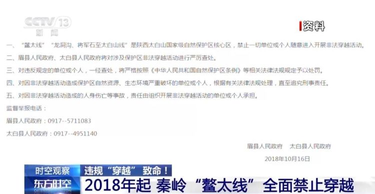 2018年,陕西省眉县和太白县人民政府联合发布公告,禁止非法穿越鳌太线。