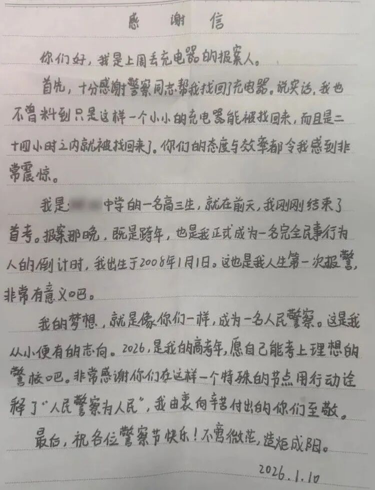 △1月10日晚,少年将手写的感谢信送至和孚派出所