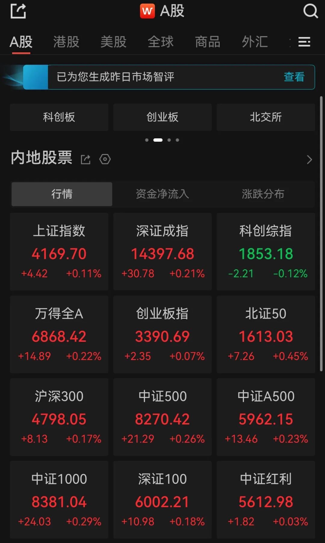 13日,A股三大指数开盘集体高开。Wind数据显示,上证指数涨0.11%,深证成指涨0.21%,创业板指涨0.07%。 AI应用题材延续强势,电商、智能体、短剧游戏方向领涨。脑机接口、商业航天、创新药概念股活跃。光伏、半导体、CPO概念股走弱。