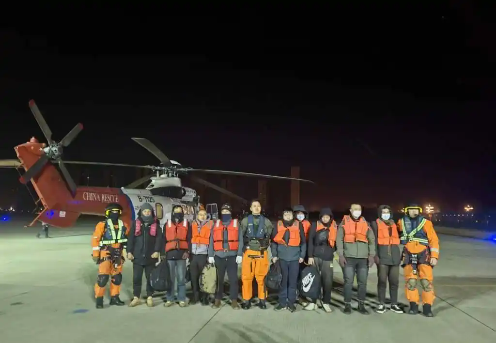 大约20分钟后,机组经过9次甲板吊运作业,顺利将9名船员转移至机舱。两架直升机随即返航,降落在蓬莱沙河口机场。目前,9名船员状态良好。