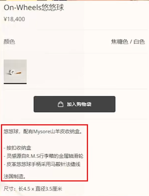 对此,爱马仕官方客服表示,该产品售价18400元,是近期推出的新品,采取皮革和马鞍针缝线手柄设计,收纳盒采用山羊皮,天然且珍贵。