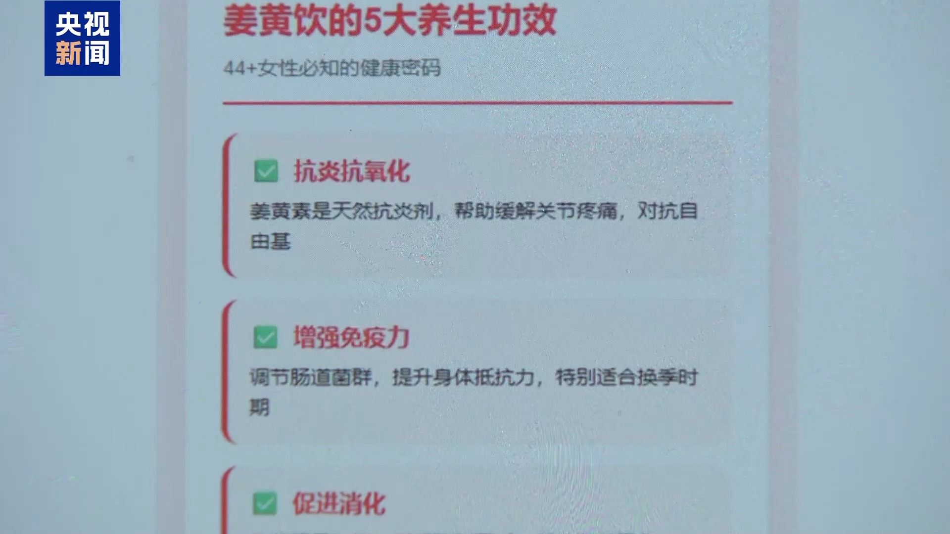 中国中医科学院西苑医院肺病科 主任医师 樊茂蓉:姜黄确实是有降脂、降血糖、减重、抗炎的作用,但是它里面的主要成分姜黄素,要达到每天1000~1500毫克,才会有这样的作用。饮料当中姜黄的含量仅有3%,比如100毫升有3克的姜黄,里面的姜黄素含量可能只有几十毫克,所以它并不能够达到抗炎的作用。