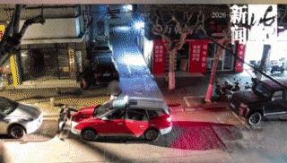 莘松派出所民警张文清:到了现场之后,就看到场面比较混乱,一辆出租车就是停在这里(人行道上),前后两辆车是前部和尾部均有被撞坏的这个痕迹。
