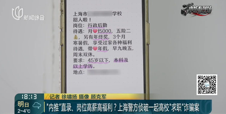 去年,李女士在社交平台看到一则可提供本市多家高校、企事业单位行政岗位"内部推荐"的广告。这些岗位往往钱多事少、福利多多。心动的李女士随即联系广告发布者,经介绍,见到了自称长期从事教育领域资源对接的王某。
