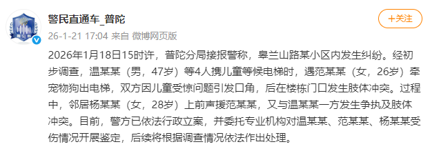 2026年1月18日15时许,普陀分局接报警称,皋兰山路某小区内发生纠纷。经初步调查,温某某(男,47岁)等4人携儿童等候电梯时,遇范某某(女,26岁)牵宠物狗出电梯,双方因儿童受惊问题引发口角,后在楼栋门口发生肢体冲突。过程中,邻居杨某某(女,28岁)上前声援范某某,又与温某某一方发生争执及肢体冲突。目前,警方已依法行政立案,并委托专业机构对温某某、范某某、杨某某受伤情况开展鉴定,后续将根据调查情况依法作出处理。