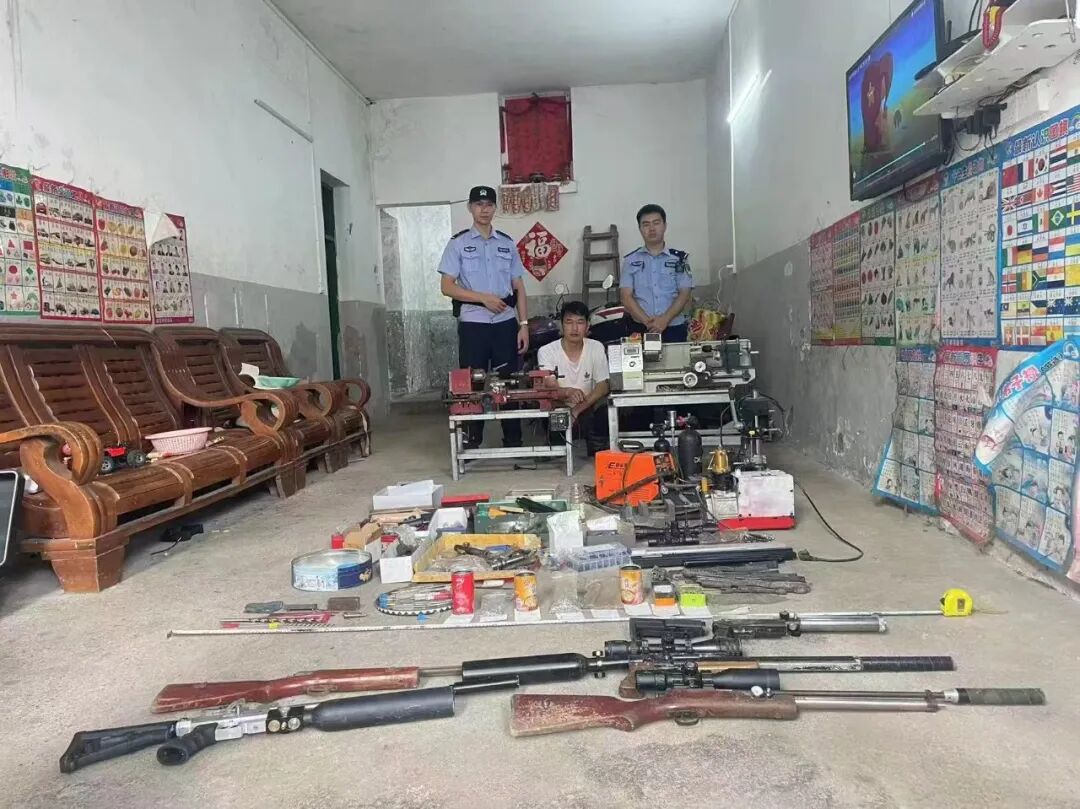 冲入韦某林居住的民房时,侦查员震惊了:这里竟是一个功能齐全的“地下兵工厂”:车床、铣床、钻床等精密机床一应俱全,桌面、地上散落着各种规格的钢管、弹簧、击发装置、瞄准镜,角落堆放着一盒盒铅弹、射钉弹、底火和大量钢珠。更令人触目惊心的是,楼梯间改造的杂物间内赫然摆放着5支已经制作完成的气枪,外形粗糙却杀伤力十足。