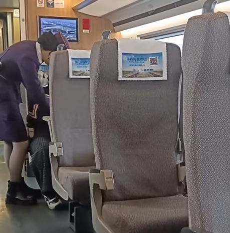 这时乘客们都关掉手机声,安静地陪伴她,列车工作人员也第一时间上前安抚。