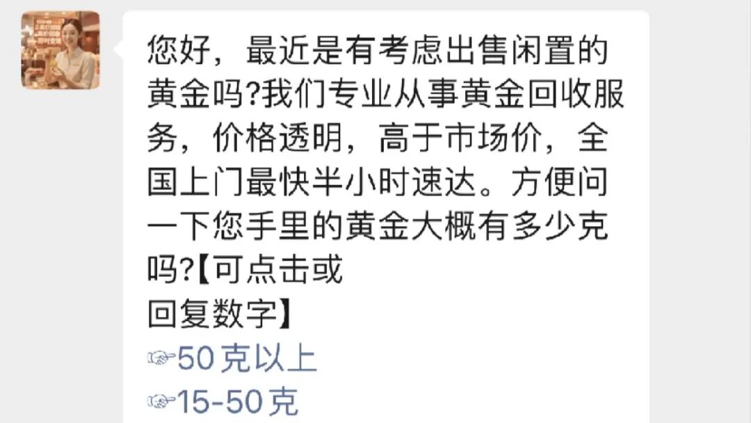 南宁市民 黄女士:因为这几天金价我感觉有点到顶了,然后有企业微信人员加了我,叫做“年轻金匠珠宝回收”。 他报的价要比市场价高 又可以上门服务。