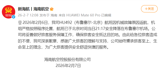 2026年2月6日,我司HU492(布鲁塞尔-北京)航班因机械故障原因返航,机组严格按照程序处置,航班已于北京时间当日21:17安全降落在布鲁塞尔机场。公司将妥善做好旅客服务保障工作,确保旅客安全抵达目的地。由此给各位旅客造成的不便,我司深表歉意,感谢广大旅客的理解与支持,公司始终秉承旅客至上、生命至上的理念,为广大旅客提供安全舒适快捷的服务。