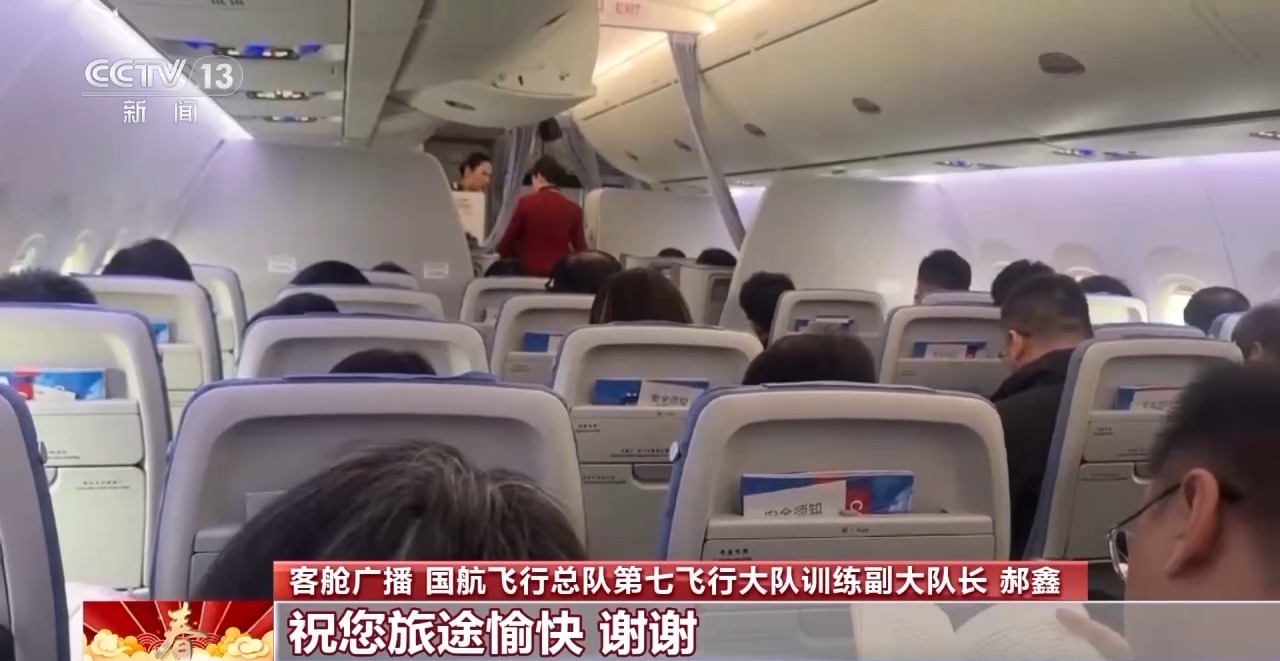国航飞行总队第七飞行大队训练副大队长 郝鑫:在这个辞旧迎新的时刻,我代表全体机组成员祝您新春快乐,万事顺意,愿这一次飞行为您的团圆之路,增添一份温暖和安心,祝您旅途愉快,谢谢。